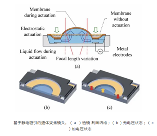 基于静电力驱动的液态镜头采用平行板电极结构,通过静电吸引力使弹性薄膜变形。这类镜头具有结构紧凑(通常小于6mm×6mm×0.7mm)、驱动电压低(小于25V)的特点,适合MEMS工艺批量制造,在微型工业视觉传感器中应用前景广阔。