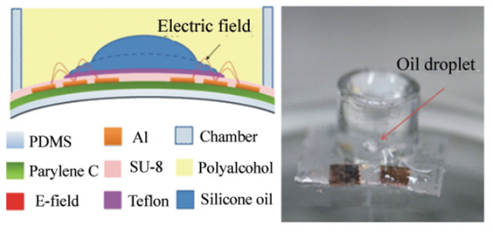 电润湿技术(EWOD)通过改变液滴与固体表面间的接触角实现曲率调控,是目前最成熟的液态镜头技术。具有响应速度快(毫秒级)、功耗低、重复性好的特点,已广泛应用于工业相机和自动化检测设备。