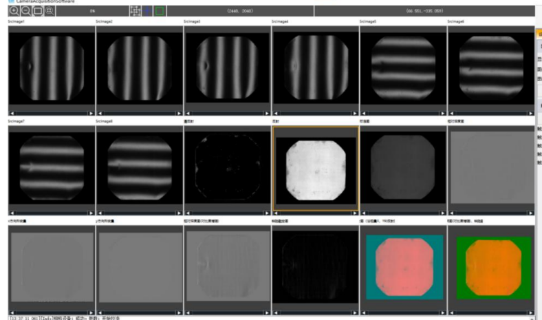 在相位偏折技术的实际应用中,投影模块将经过优化设计的正弦条纹序列投射至待测表面,高速相机同步采集经表面梯度调制后的形变条纹图案,图像数据实时传输至相位解析单元。经解算处理后生成相位图与相位展开图,可快速转换为微米级精度的高度分布,一次性实现微凹坑、划痕、粉尘等缺陷的高效检测。